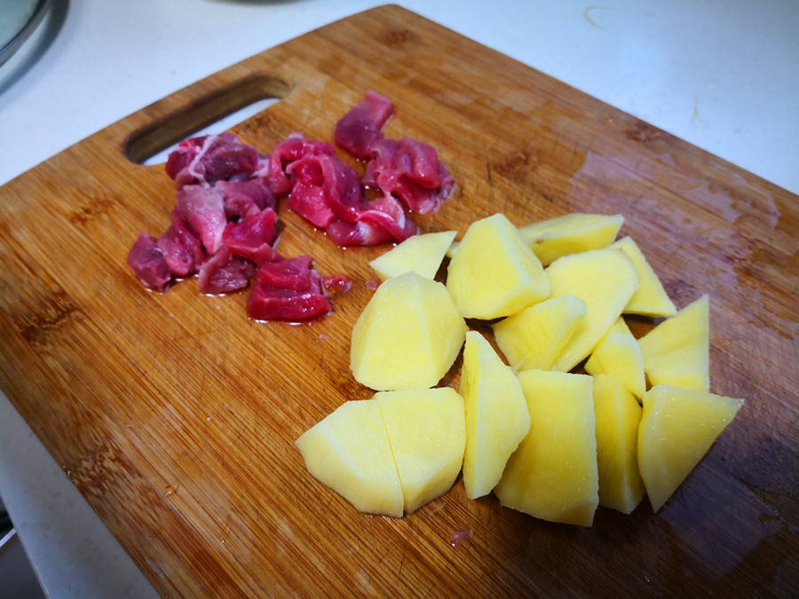 2.准备一块猪肉,最好是五花肉,切成厚片或块状备用;再准备几个土豆,削皮洗净后切成土豆块备用;葱花和姜丝也准备一些。