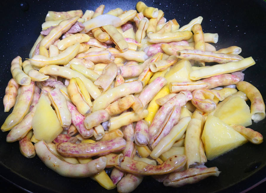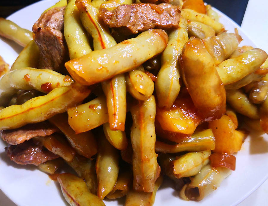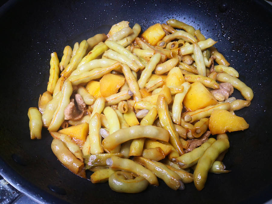 炒出香味后加入1勺老抽,让猪肉均匀上色,然后再加入2勺生抽提鲜,快速翻炒10秒后,将豆角和土豆倒入,大火快速翻炒片刻,炒至豆角的颜色由红变黄,表面微微发皱、变软时再倒入适量的热水,水时没过食材即可。