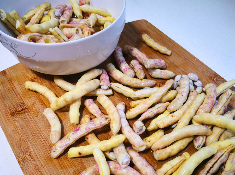 1.先将豆角掰去两端和老筋,用清水多冲洗几遍,沥干净水分后掰成长段,如果豆角较短也可以不掰,掰的时候小心不要把中间的豆粒掉出来,这个豆粒炖好后吃着特别香,可别浪费了!